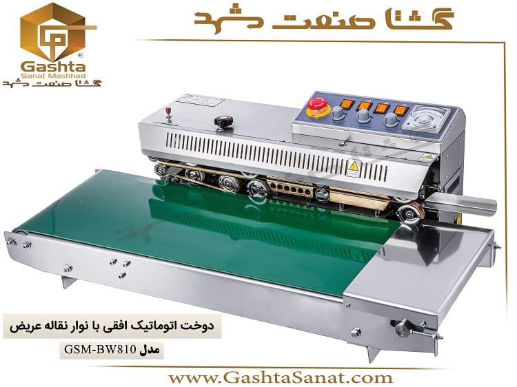 دستگاه بسته بندی دوخت اتوماتیک افقی با نوار نقاله عریض مدل GSM-BW810