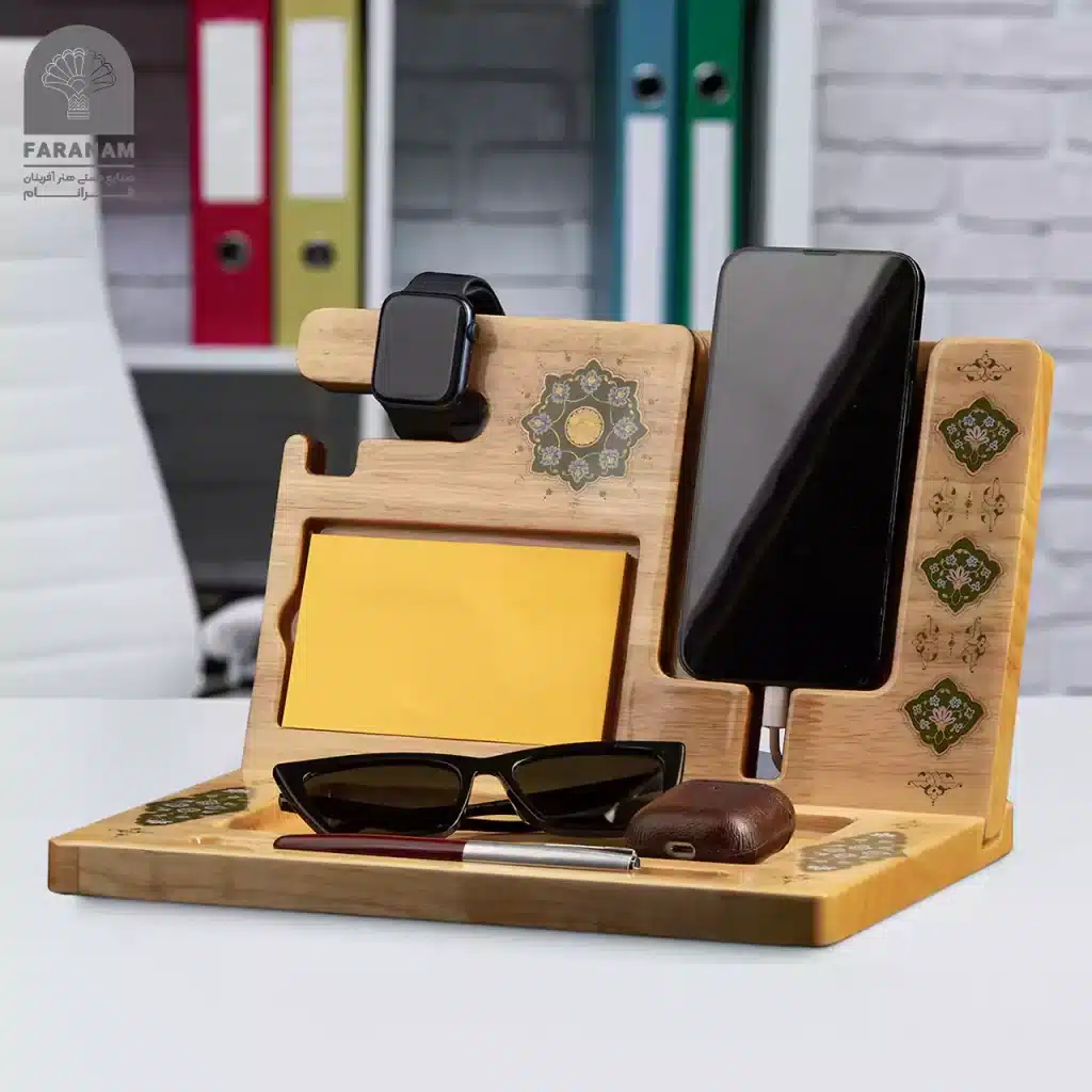 ابعاد: 4\*30\*21 * وزن: 1278 گرم * تهیه شده از چوب رابروود و مزین شده با هنر خاتم * دارای سه مرحله پلی استر جهت افزایش طول عم