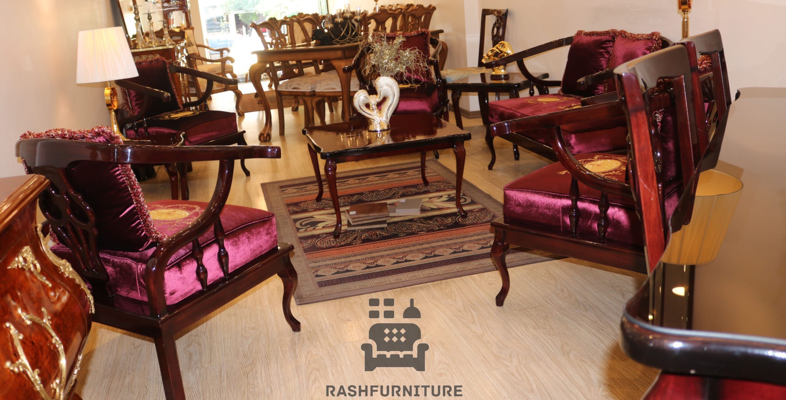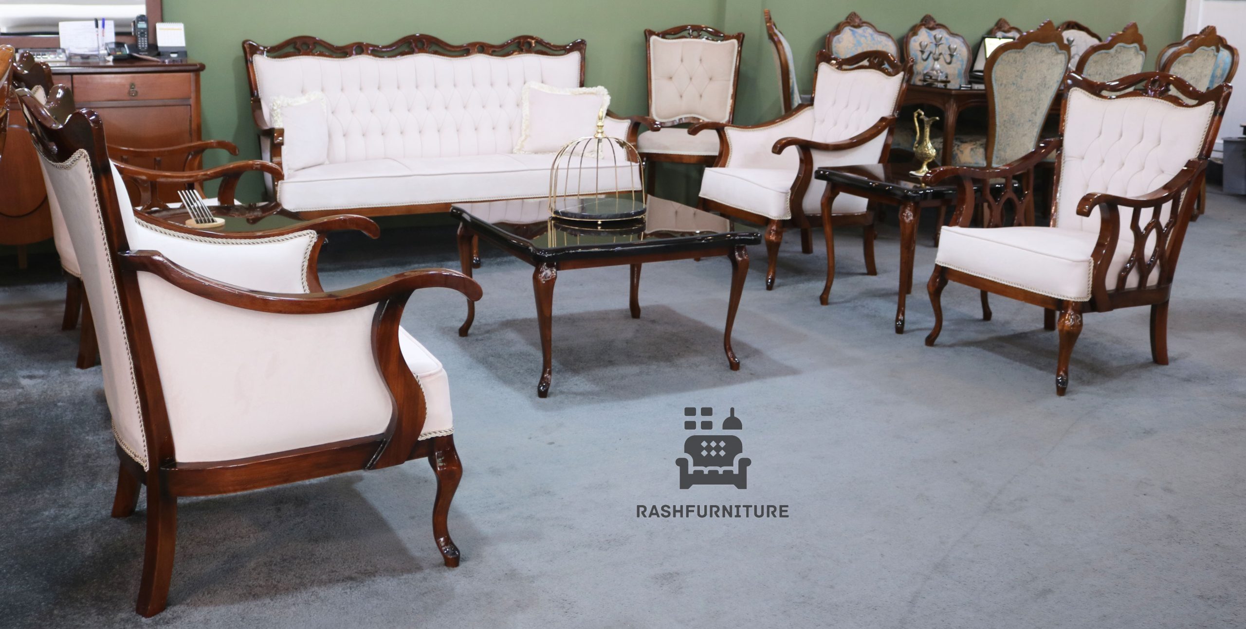 رسال رایگان سرویس 7 نفره شامل یک عدد کاناپه 3 نفره 4 عدد مبل تکنفره یک میز جلو مبل و دو عدد میز عسلیو دو عدد کوسن میباشد / چوب راش/ فوم سرد