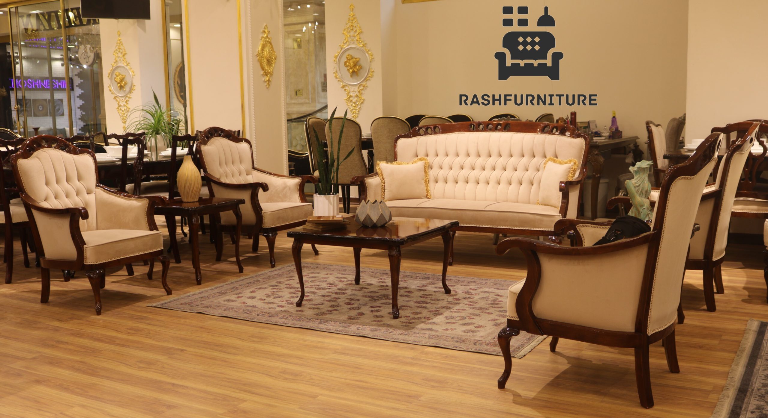 رسال رایگان سرویس 7 نفره شامل یک عدد کاناپه 3 نفره 4 عدد مبل تکنفره یک میز جلو مبل و دو عدد میز عسلیو دو عدد کوسن میباشد / چوب راش/ فوم سرد